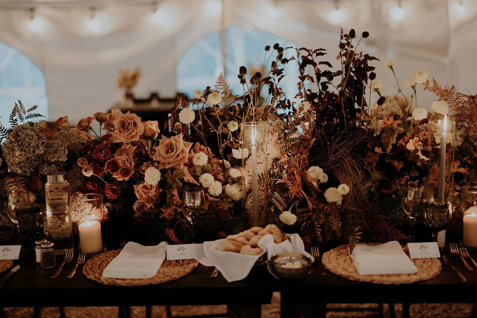 Use of our all our stuff, like ceremony seating and a stage with arch, cocktail tables, vintage furnishings and lounge seating, bars, harvest tables, tent, cafe and string lights all around